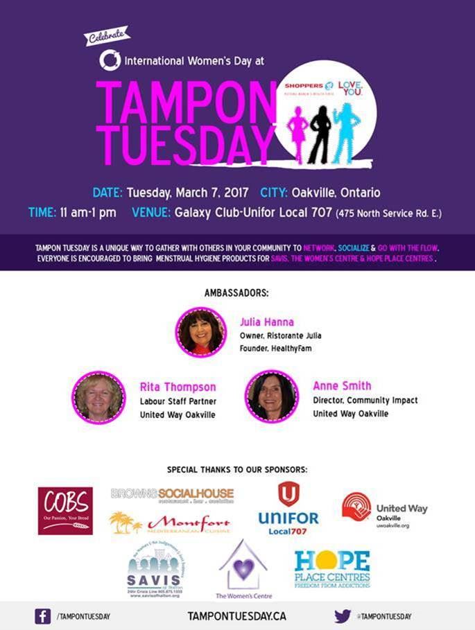 Labour Community Services and United Way Oakville are holding our “First Annual Tampon Tuesday Event”. Simultaneous events are taking place across Canada to help women’s shelters and other organizations ensure that women in need have access to necessary feminine hygiene products, (FHP)